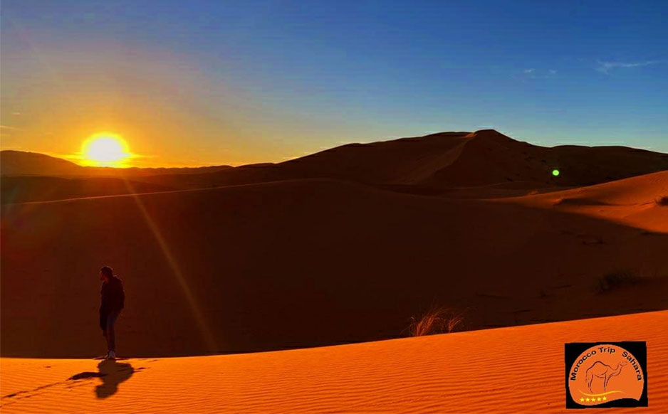 The trip of two days includes such fascinating places. They are the followings. There are a castle of Ait Ben Haddou and discovery of its beauty and the prowess of its builders. It is a UNESCO world heritage site. The city of Ouarzazate is the next destination. In it we have lunch. The Agdz’ oasis is the next point to reach after lunch. On the way to Zagora, Draa Valley is companying us alongside the way. It is the longest river in the kingdom of Morocco. .Upon our arrival in Zagora in the afternoon, we get ready to ride a camel to desert camp located in the deep desert dunes. Dinner is served in direct contact with a starry sky.