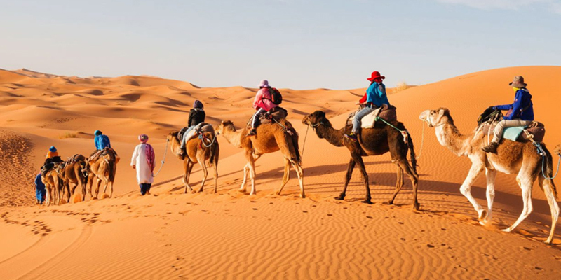 - For desert lovers, we recommend visiting Merzouga, the home of golden sand and clear sky. If you are one of those people who like to explore the desert and enjoy its calm atmosphere, Merzouga is where you will find what you are looking for. In Merzouga, you will learn how to ride camels and go in a tour throughout the high dunes of Erg Chebbi. You will also spend nights in the heart of the desert and listen to some Amazigh music as well as taste the local’s dishes. In addition to that, you will have the chance to watch the amazing sunset and sunrise and take some lovely pictures as souvenir.