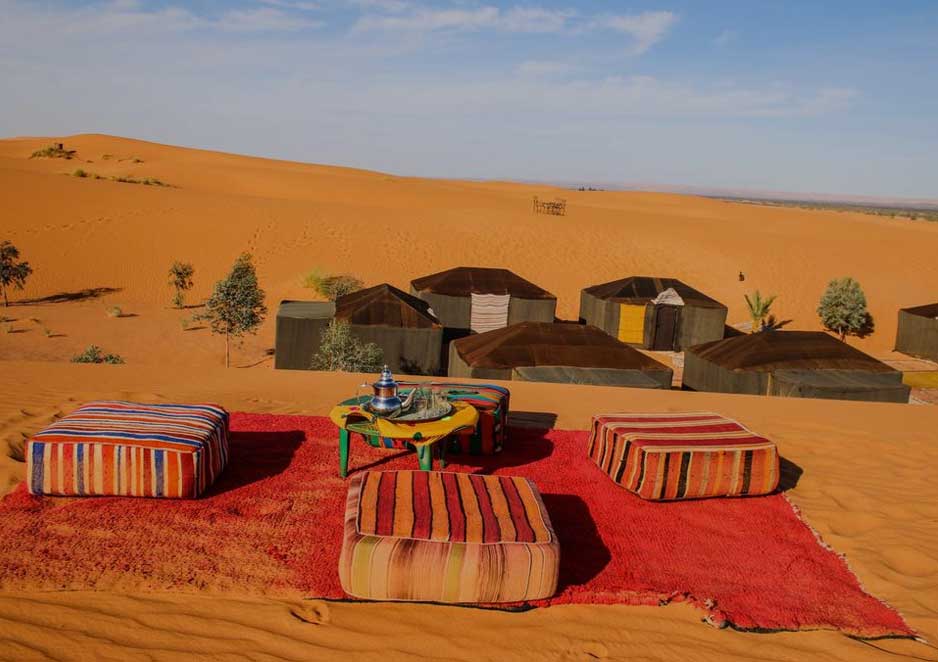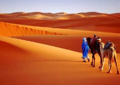 Before you arrive to the location where your trip will begin. We will pack the camels with food, blankets, and prepare everything you will need for this amazing camel trek. We will head to the secluded desert at night. Right in the middle of the dunes, we will find the oasis, where we will spend the night. The night in the desert is unforgettable. The sky is crystal-clear, the stars sparkle and shine with intensity. The first night of your camp, you will have the dinner around the fire with a drum party. The next morning we will head our next destination, the trip will take us about two hours. We will have our lunch next to the desert tree ‘Tamarist’ for one or two hours (having rest and fun in the shadow).  When we finish our lunch, we will pay the Touareg family a visit, where we will spend the second night of our trip. Next day after having our breakfast together with the Touareg family. We will head to the next oasis, located in the middle of the desert two. We will have our lunch on the way. You will spend your third night in the desert with the nomad families. Between the dunes and the camels, enjoying the drum music. Next morning, after having breakfast will head the auberge or the accommodation your staying in. Each day we will have about 90minutes to two hours of camel trekking.